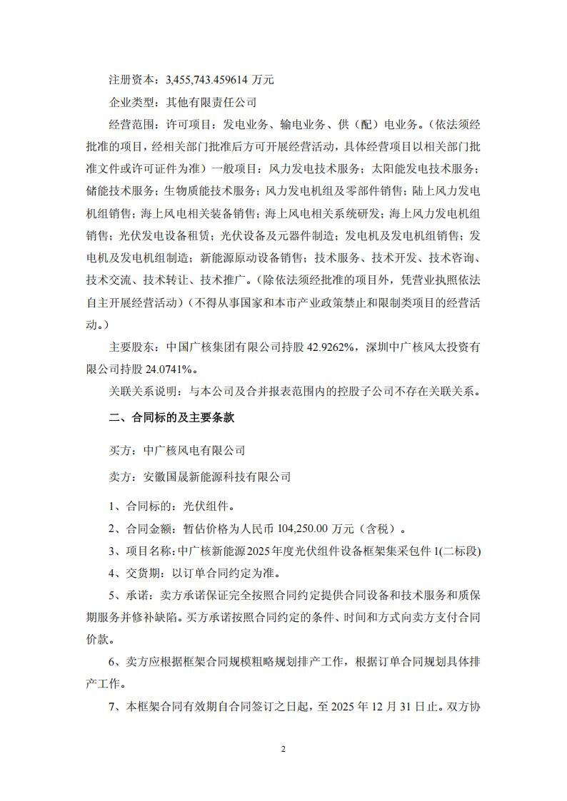 根据公告,近日,国晟科技二级控股子公司安徽国晟新能源科技有限公司与中广核风电有限公司签订了《中广核新能源2025年度光伏组件设备框架集采包件1(二标段)采购合同》。
