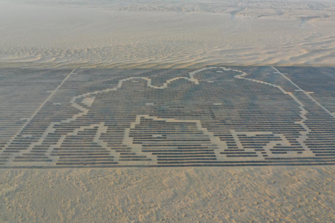 五凌电力宁夏事业部阿拉善右旗光伏+储能电站位于阿拉善右旗巴丹吉林沙漠边缘,占地面积2712亩。该电站采用新能源+光伏治沙、生态修复、生态旅游、智慧储能为一体的模式,总装机容量10万千瓦。电站结合内蒙古自治区民族特色,利用光伏阵列的间距调整融入骆驼图案,成为沙漠中的一道亮丽风景,体现阿拉善右旗“中国驼乡”特色,成为当地的旅游名片。