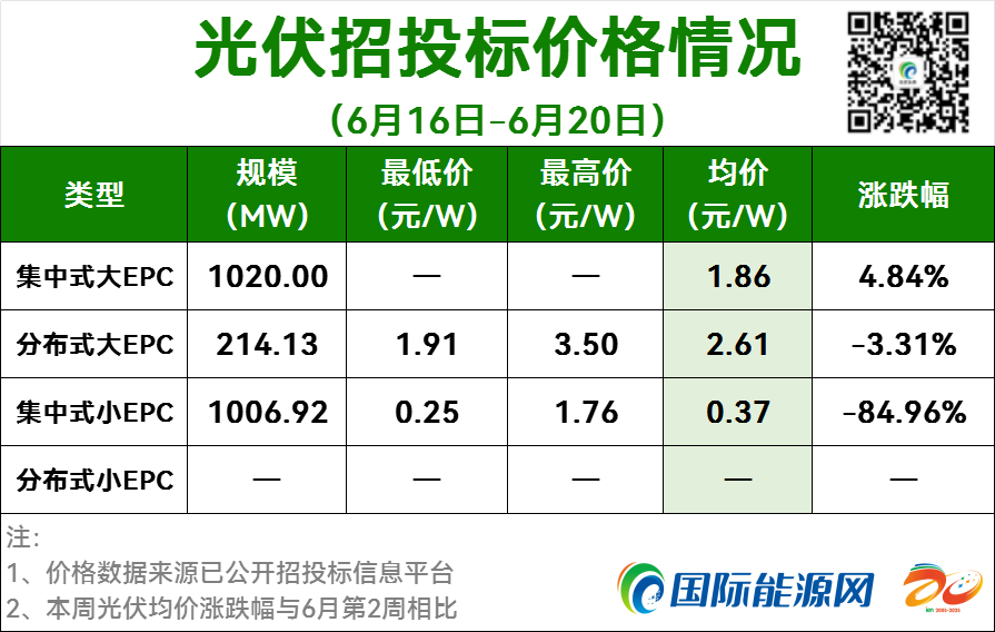 光伏头条根据6月16日至6月20日光伏EPC市场情况,精选展示最高价以及最低价项目。