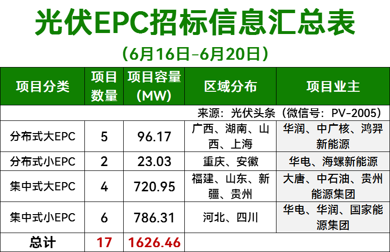 对6月第3周(6月16日-6月20日)光伏EPC招/中标项目公开信息不完全统计,本周招标规模合计1626.46MW,中标规模合计2241.05MW,招中标规模合计3867.52MW。