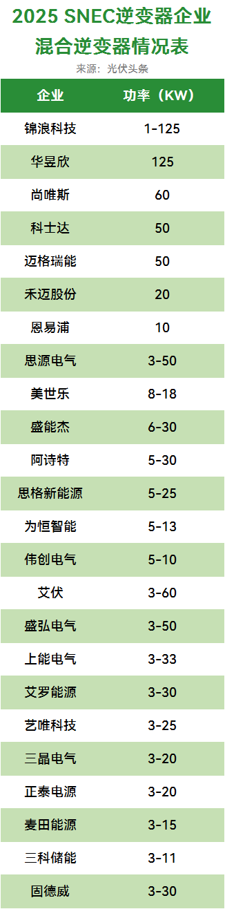 光伏头条2025年SNEC现场统计,包括思格新能源、锦浪科技、华昱欣、尚唯斯、科士达、迈格瑞能、禾迈股份、恩易浦、思源电气、美世乐、盛能杰、阿诗特、为恒智能、伟创电气、艾伏、盛弘电气、上能电气、艾罗能源、艺唯科技、三晶电气、正泰电源、麦田能源、三科储能、固德威等24家逆变器企业推出混合逆变器。其功率段多数企业在3-30之间,锦浪科技、华昱欣等企业则推出了高达125kW的大功率混合逆变器。