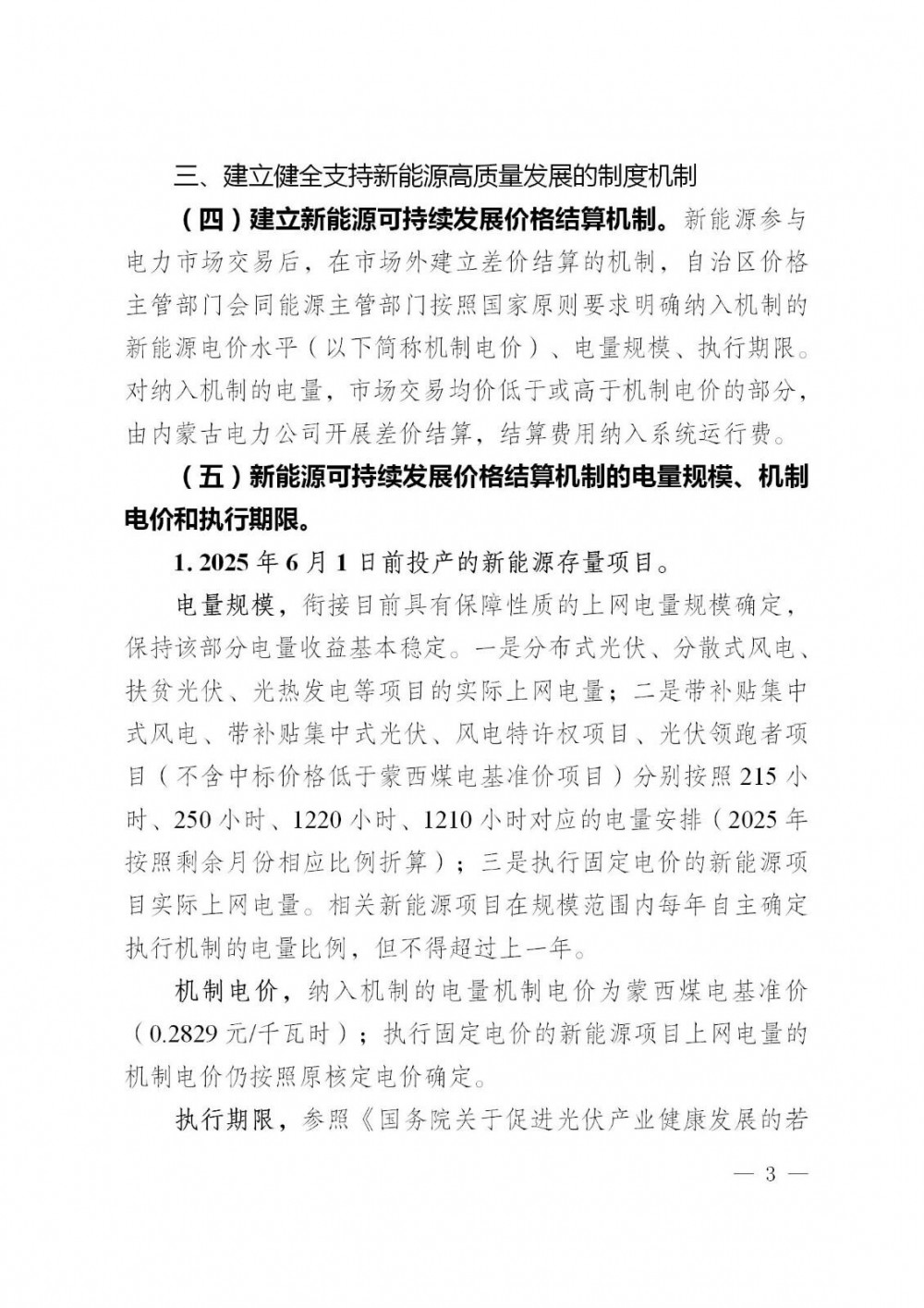 电量规模:衔接目前具有保障性质的上网电量规模确定,保持该部分电量收益基本稳定。一是分布式光伏、分散式风电、扶贫光伏、光热发电等项目的实际上网电量;二是带补贴集中式风电、带补贴集中式光伏、风电特许权项目、光伏领跑者项目(不含中标价格低于蒙西煤电基准价项目)分别按照215小时、250小时、1220小时、1210小时对应的电量安排(2025年按照剩余月份相应比例折算);三是执行固定电价的新能源项目实际上网电量。相关新能源项目在规模范围内每年自主确定执行机制的电量比例,但不得超过上一年。