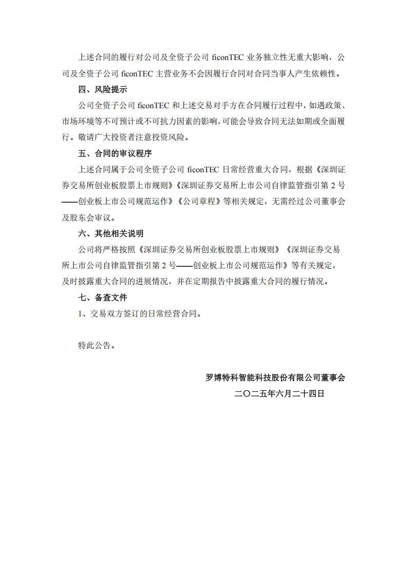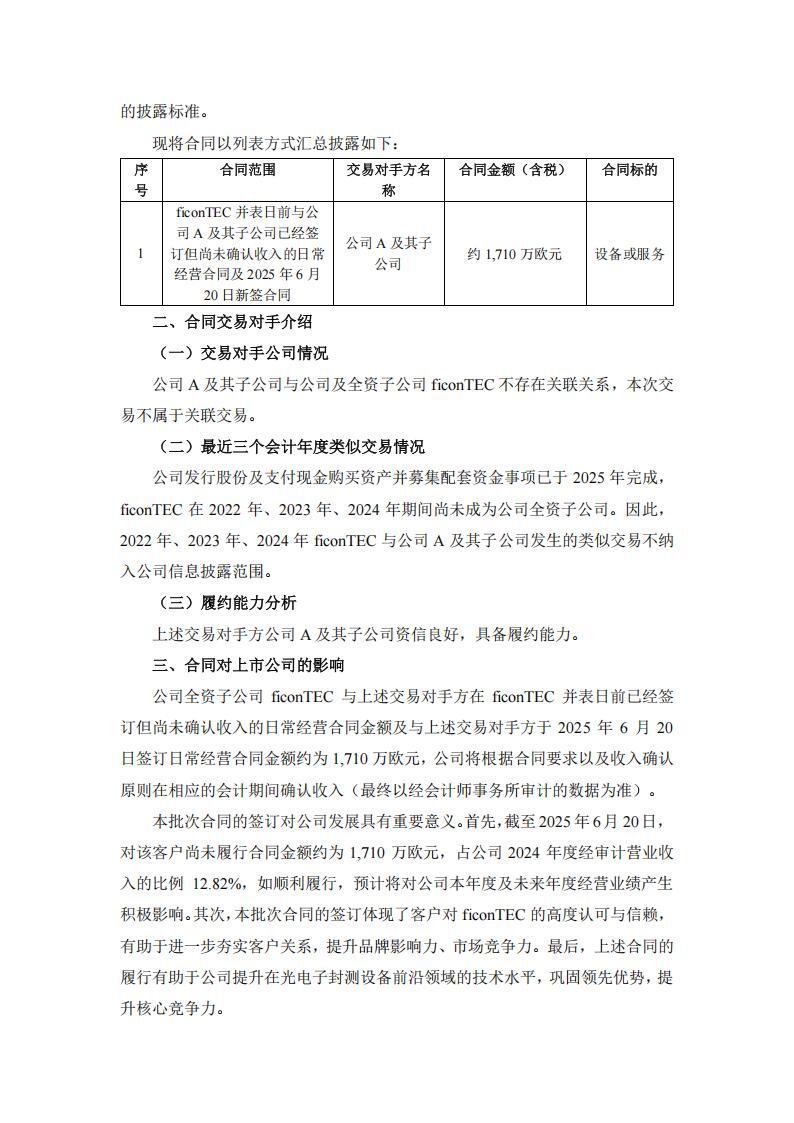 根据公告,罗博特科全资子公司 fiConTECService GmbH 和 ficonTEC Automation GmbH与同一交易对手美国某头部公司 A 及其子公司在 ficonTEC 并表日前已经签订但尚未确认收入的日常经营合同金额及与公司 A 及其子公司于 2025 年 6 月 20 日签订日常经营合同金额约为 1,710 万欧元(折合人民币已超过 1 亿元),占罗博特科2024 年度经审计营业收入的比例超过了 12.82%。