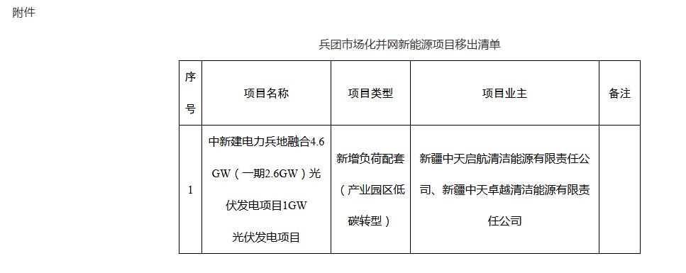 关于将中新建电力兵地融合4.6GW(一期2.6GW)光伏发电项目1GW光伏发电项目移出兵团市场化并网新能源项目清单的公示