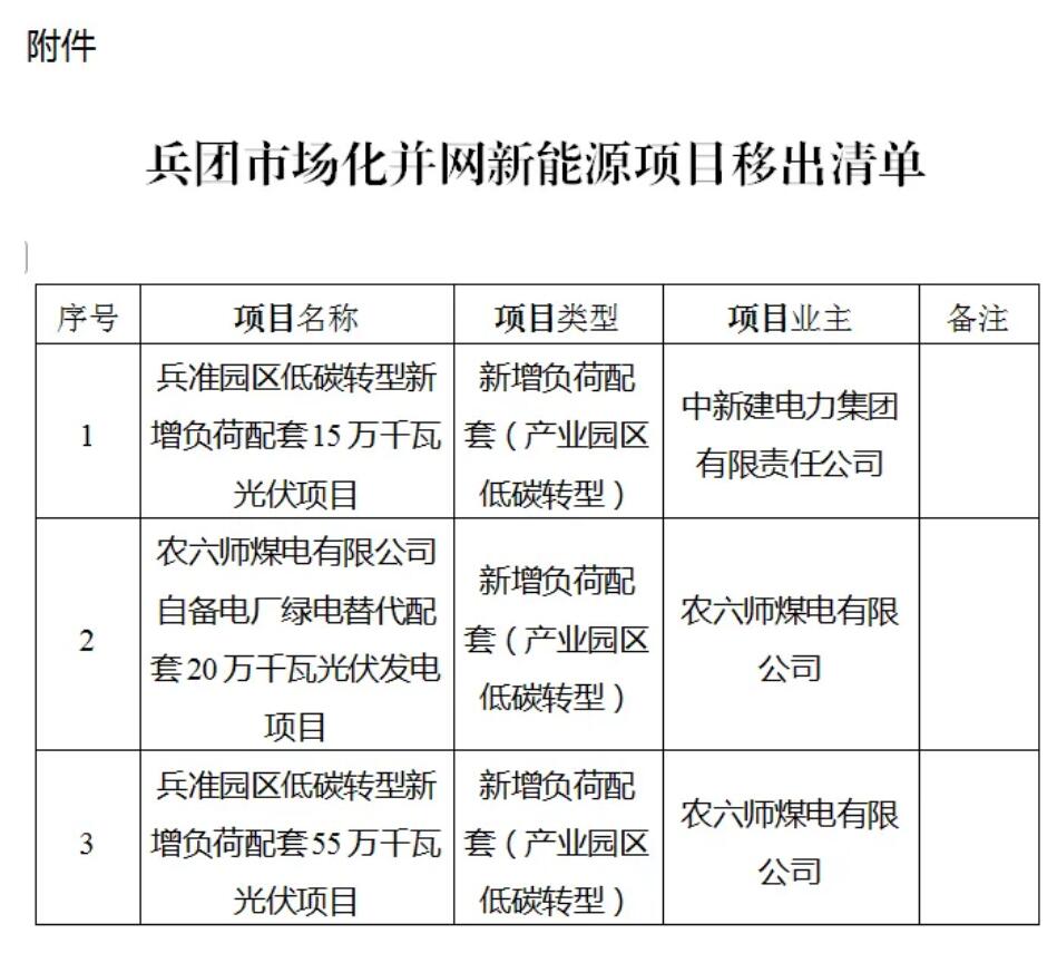 关于将中新建电力兵准园区低碳转型新增负荷配套15万千瓦光伏等三个项目移出兵团市场化并网新能源项目清单的公示