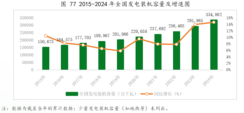 近年来,我国电力工业快速发展,发电装机容量在2013年突破12亿千瓦,成为世界上发电装机容量最大的国家,并在2019年首次突破20亿千瓦。2024年发电装机规模再创历史新高,尤其是可再生能源领域风电和太阳能的发电装机容量迅猛增长。