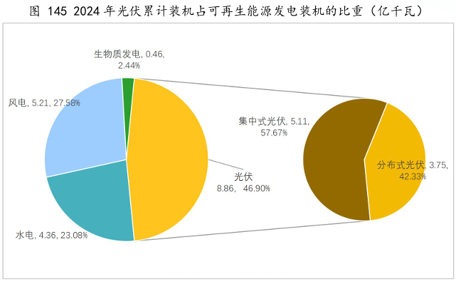 报告数据显示:2024年我国太阳能发电装机容量持续增长,展现出巨大的发展潜力。全国光伏新增装机2.77亿千瓦,同比增长28%。其中,集中式光伏1.59亿千瓦,分布式光伏1.18亿千瓦。全国光伏累计装机容量8.87亿千瓦,同比增长45.2%。其中,集中式光伏5.11亿千瓦,分布式光伏3.75亿千瓦。
