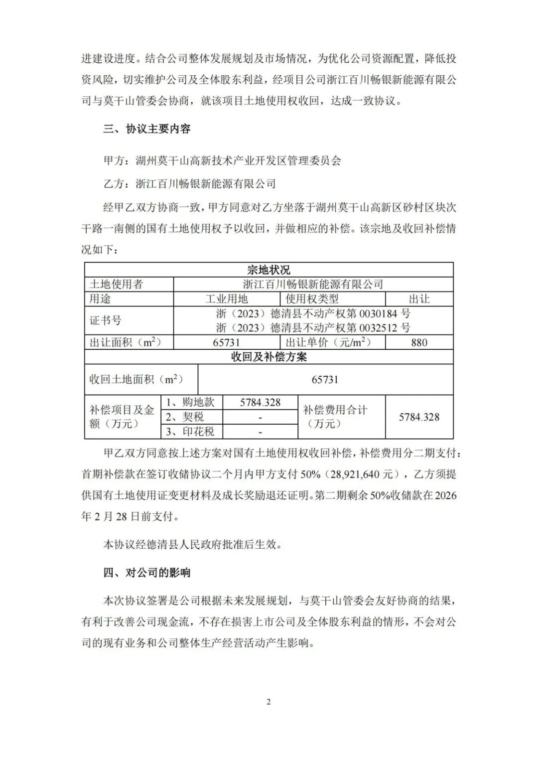 2025年6月16日,公司与莫干山管委会签署了《高效异质结电池项目补充协议》,协议就退还成长奖励及项目用地收储达成约定。