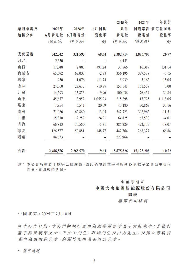 7月10日,大唐新能源发布2025年6月发电量公告。