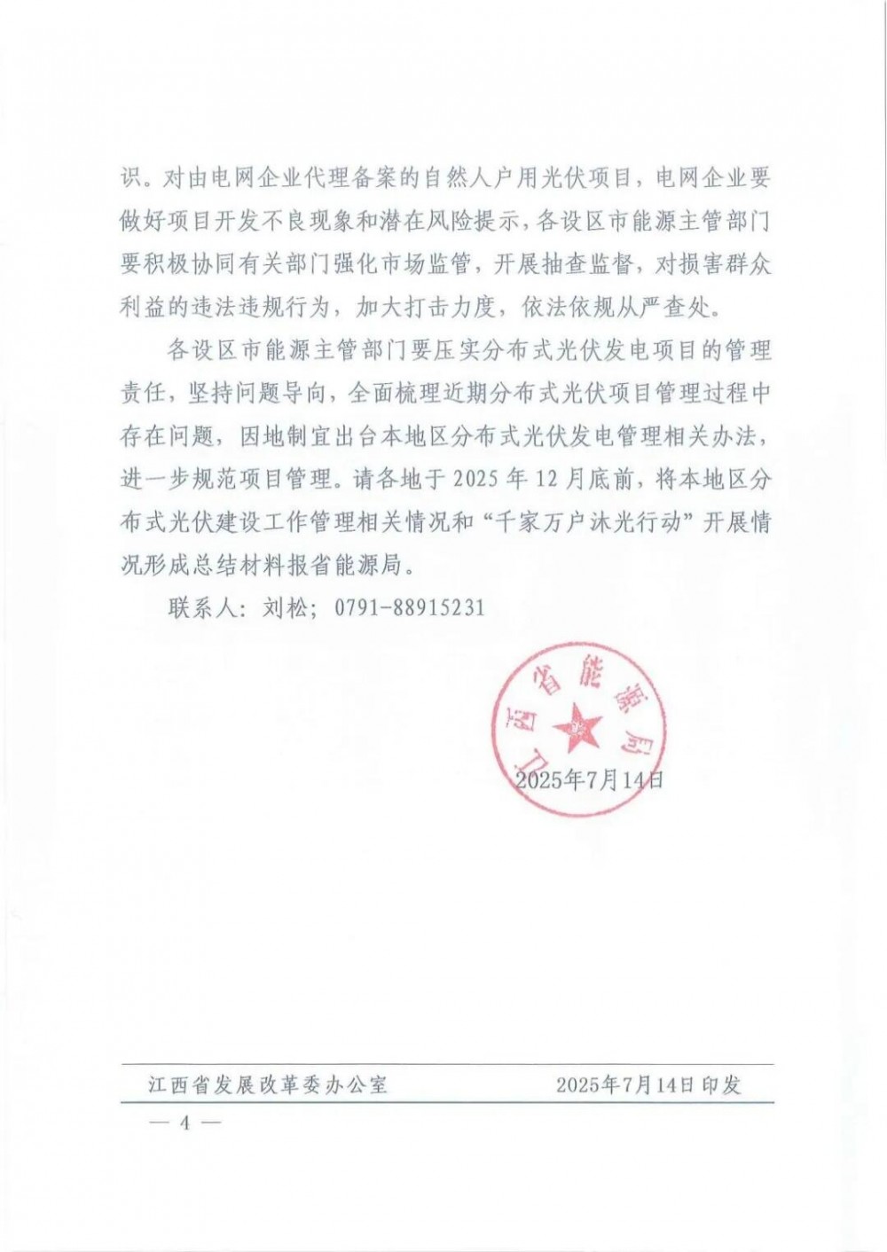 7月14日,江西省能源局发布关于进一步做好分布式光伏发电开发建设管理有关工作的通知。
