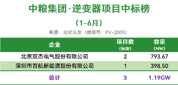 中粮集团1.19GW逆变器集采项目于2025年上半年定标,该项目分为3个标段,双杰电气、首航新能最终中标。