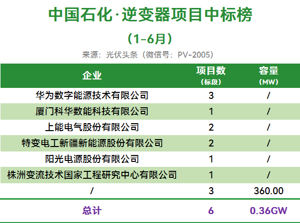 中国石化定标项目6个,合计容量0.36GW。