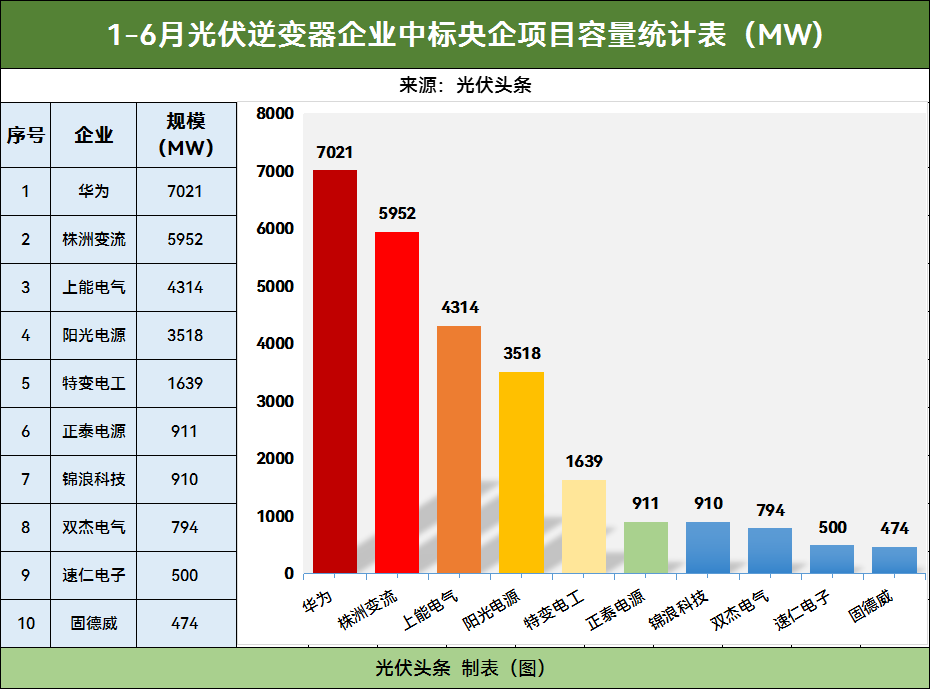 虽然光伏逆变器行业格局相对稳定,但在央企的项目中,考虑价格、市场渠道、后期服务等方面,也有大量企业赢得了央企的订单。光伏头条根据公开信息整理详细榜单如下: