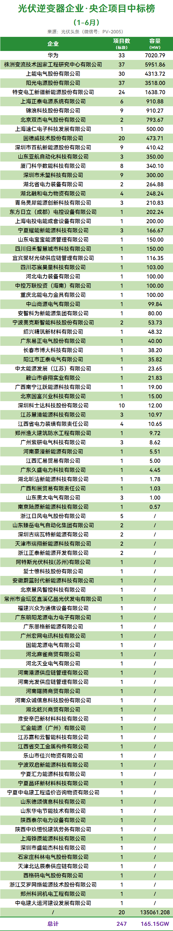光伏头条根据公开信息统计,2025年1-6月,28家央企约247个光伏逆变器招标项目定标,合计容量约165.15GW。