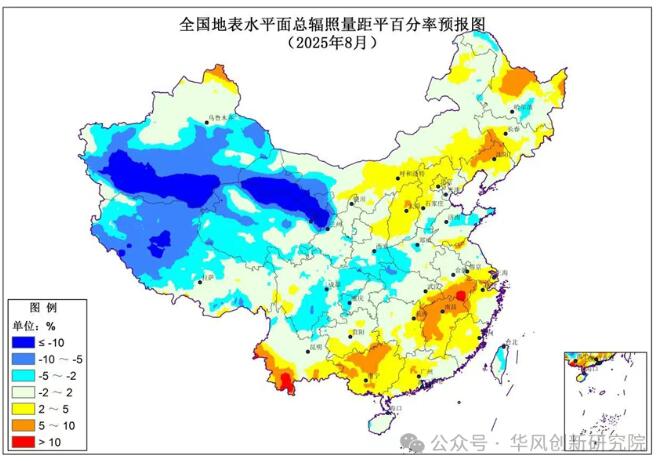 内容显示,预计2025年8月,我国陆地水平面总辐照量与常年(1991-2020年)同期相比:黑龙江中部、辽宁大部、河北北部、山西大部、江南大部、华南大部、云南南部等地偏大2%至10%,部分地区偏大10%以上;新疆南部和东部、甘肃中西部、青海大部、西藏中西部、四川南部和东部等地偏小2%至10%,部分地区偏小10%以上;我国其他大部地区接近常年同期。