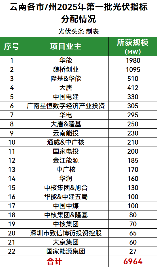 项目业主方面,华能、魏桥创业、隆基&华能、大唐、中国电建、广南星恒数字经济产业投资、华电、大唐&隆基、云南能投、通威&中广核、国家电投、金江能源、中广核、华润、中核集团&旭合、华能&中建五局、中国中煤、中核集团&隆基、中核集团、深圳市致信博衍投资控股、大京集团、国家能源集团等22家企业或联合体获得光伏指标。