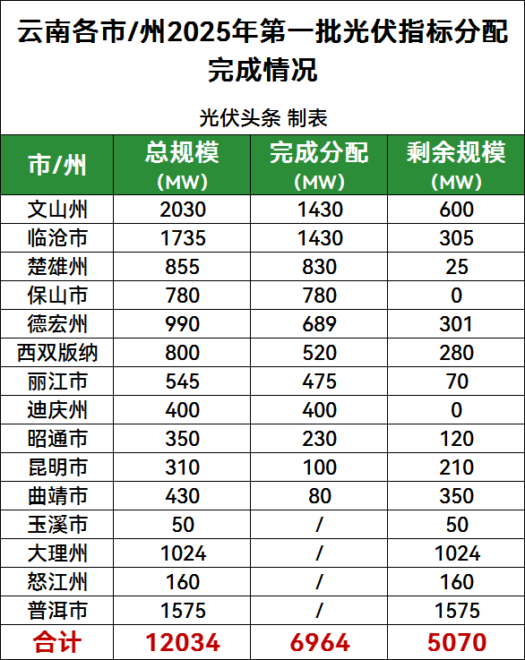 对比《云南省2025年第一批新能源项目开发建设方案》,2025年第一批下发光伏项目规模12.03GW,已完成6.964GW竞配,剩余竞配规模5.07GW,总完成率57.87%。