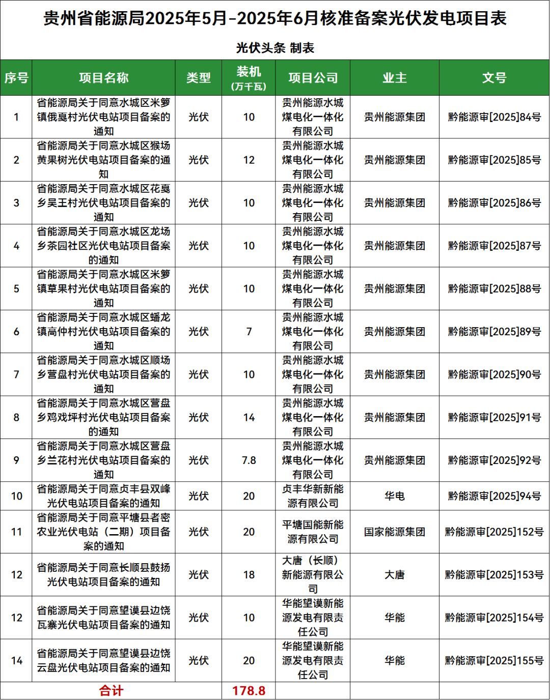 光伏头条获悉,7月23日,贵州省能源局发布2025年5月-2025年6月核准备案风电光伏发电项目情况。