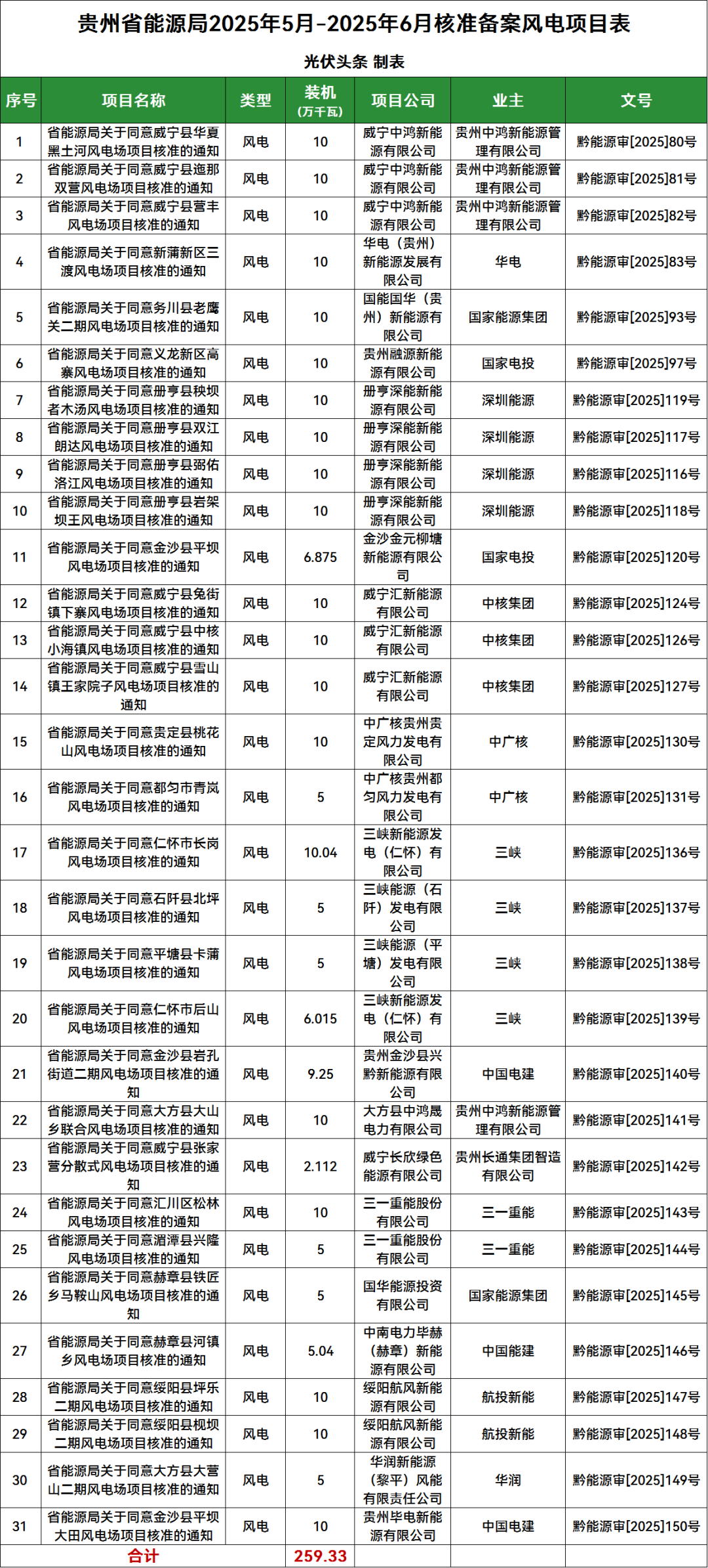 贵州省能源局2025年5月-2025年6月核准备案风电光伏发电项目情况