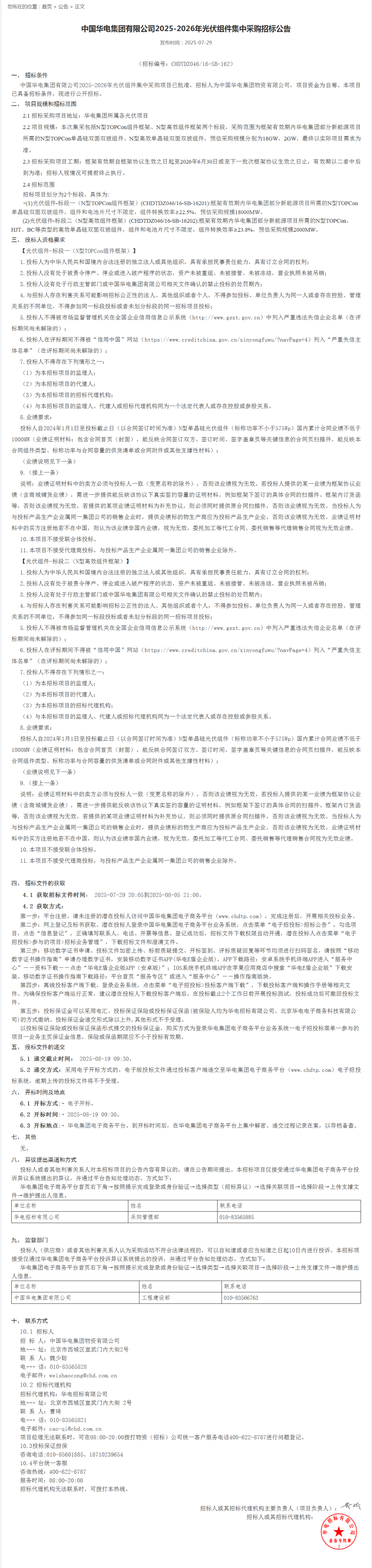 光伏头条获悉,7月29日,中国华电集团有限公司2025-2026年光伏组件集中采购招标公告发布。