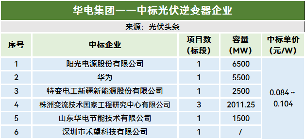 华电集团18GW逆变器集采项目确定中标人,阳光电源、华为、特变电工、株洲变流、山东华电节能技术有限公司等5家企业成为最大赢家,合计赢得18GW订单。