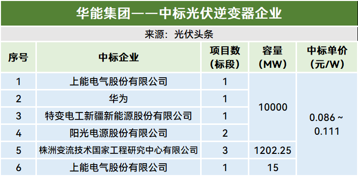 5、中标企业方面,华为、阳光电源、株洲变流、特变电工、上能电气、华电节能、双杰电气、正泰电源、锦浪科技、固德威等155家企业中标。