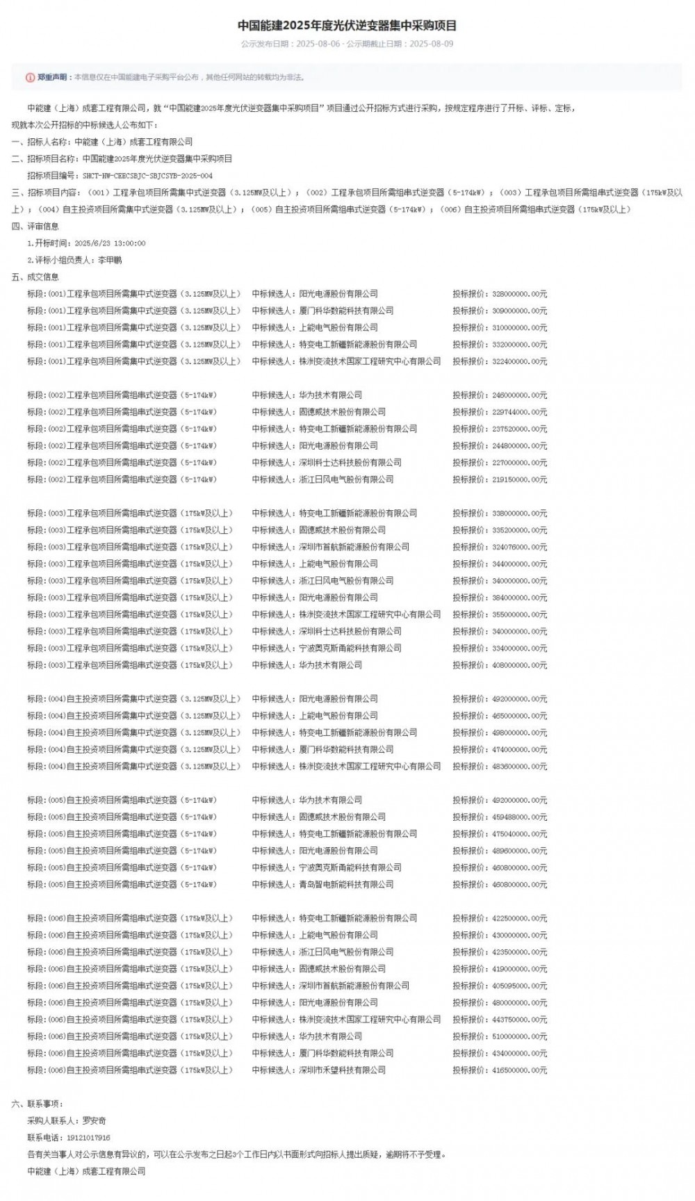 光伏头条获悉,8月6日,中国能建2025年度光伏逆变器集中采购项目中标候选人公布。