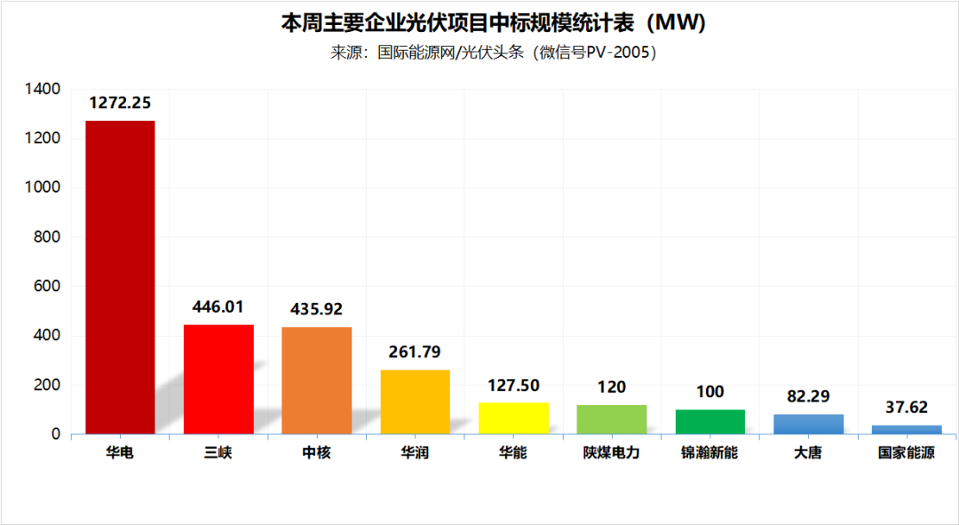 /光伏头条(PV-2005)统计本周华电、三峡、中核、华润、华能、大唐、国家能源集团等企业发布了37个中标项目,总规模2883.37MW。其中,华电以1272.25MW位列第一,三峡以446.01MW排名第二,中核以435.92MW位列第三。