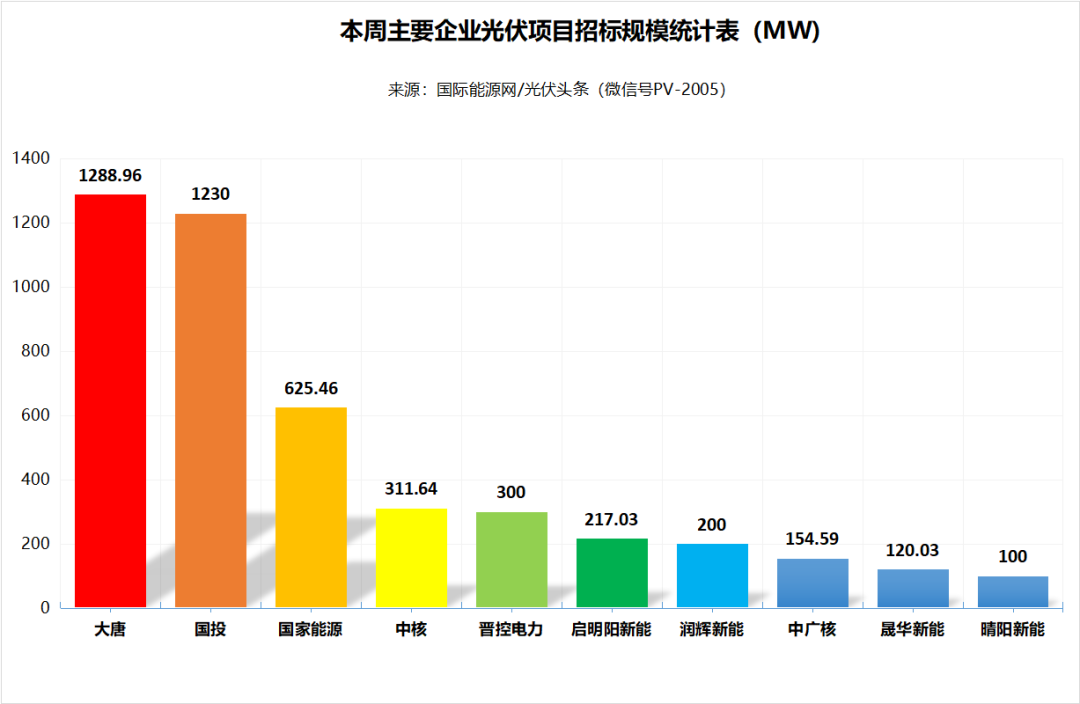/光伏头条(PV-2005)统计,本周大唐、国投、国家能源集团、中核集团、中广核等企业发布了53个光伏招标项目,装机规模合计4716.07MW。