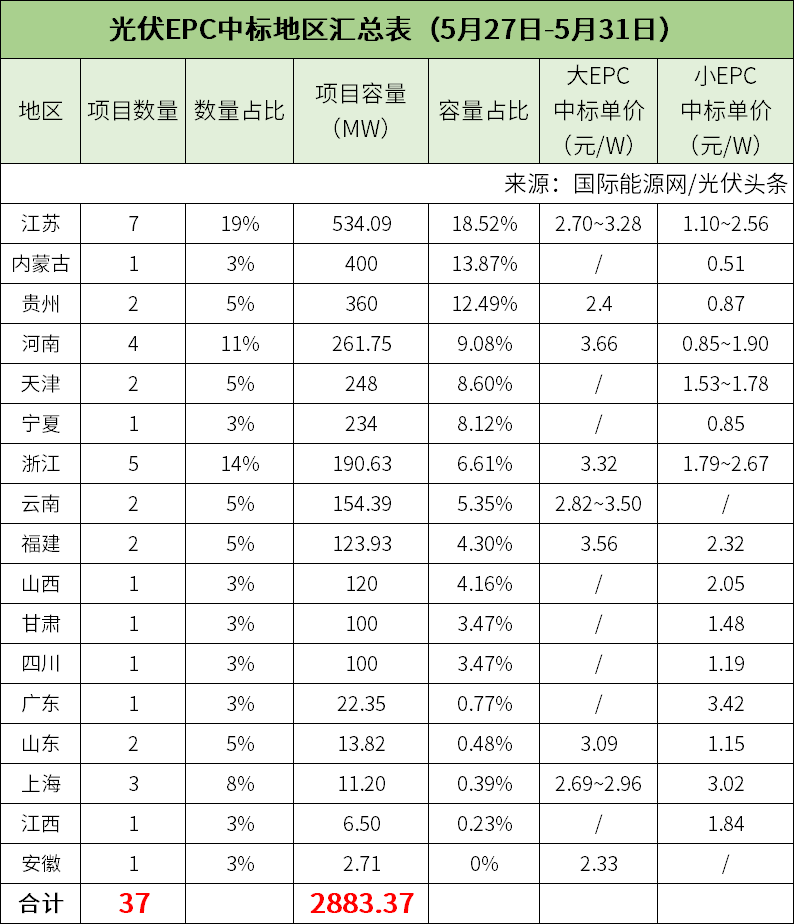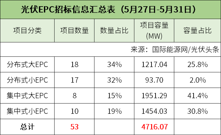 /光伏头条(PV-2005)对5月第5周(5月27日-5月31日)光伏EPC招/中标项目不完全统计,本周招标规模合计4716.07MW,中标规模合计2883.37MW,招中标规模合计7599.44MW。