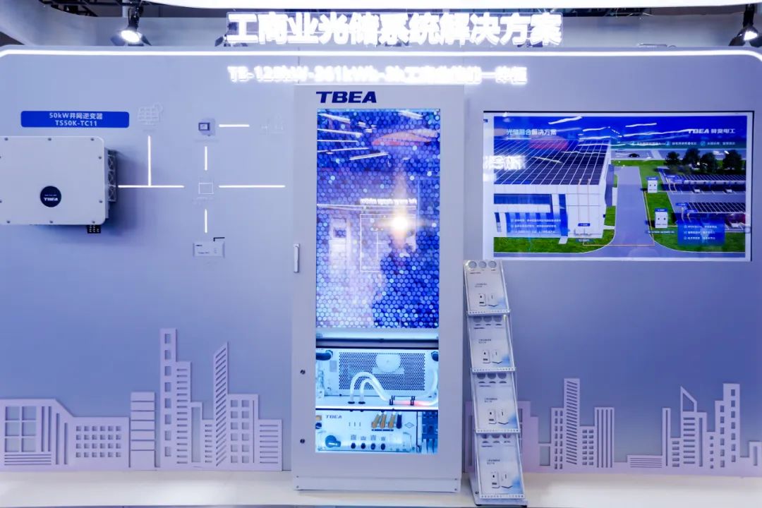 特变电工新能源储能交直流一体方案(BPS)以独特架构和设计,能实现调试时间减少50%、安装时间减少80%的极速部署,还具备安全保障与宽温域适配能力。此外,工商业储能一体柜也一同亮相,它是一款极致安全、稳定高效和电网友好的工商储一体柜明星产品。系统支持三相三线/三相四线交流接入,支持快速并离网切换、离网模式运行及黑启动,灵活适配于工商业全场景。