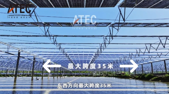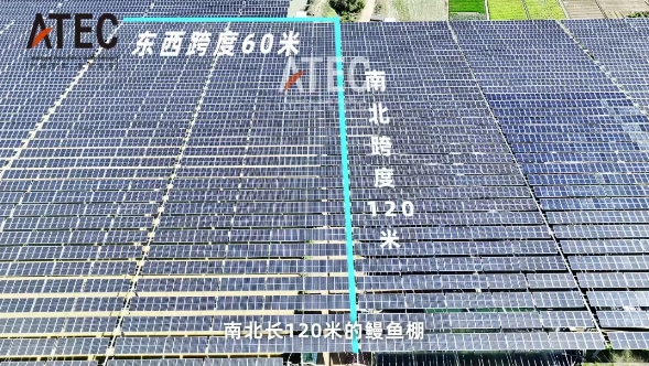 组件距离地面4米净空,东西方向最大跨度35米,南北中桩6.8米,南北中梁大空间桁架梁最大跨度150米,利用柔性支架大跨度高净空的特点,在棚内只打一排桩的情况下,横跨东西长60米、南北长120米的鳗鱼棚。