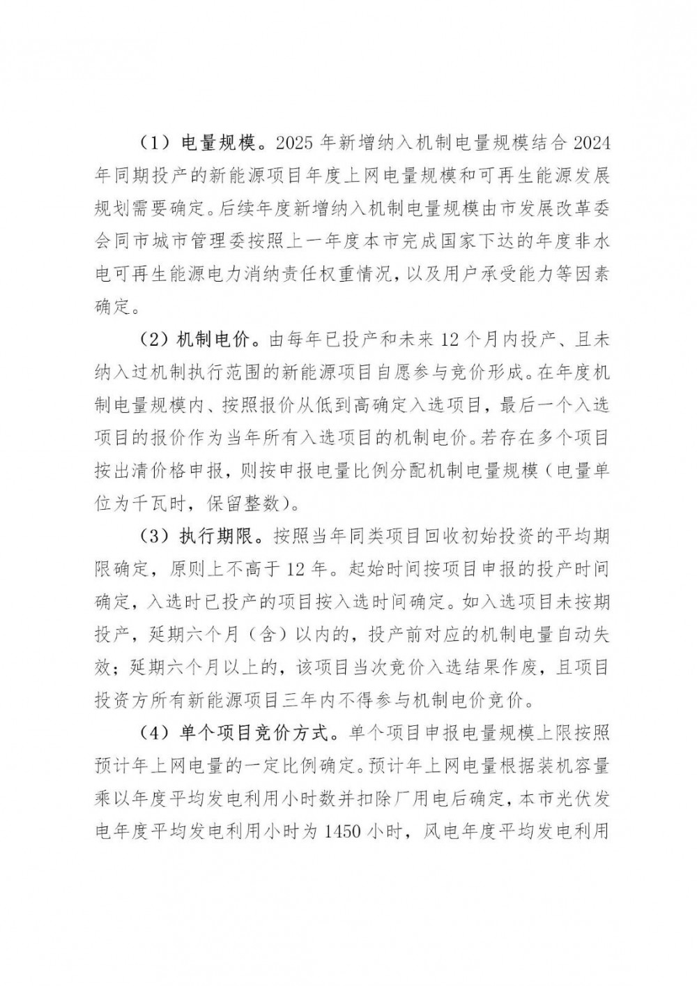 执行期限。按照当年同类项目回收初始投资的平均期限确定,原则上不高于12年。起始时间按项目申报的投产时间确定,入选时已投产的项目按入选时间确定。如入选项目未按期投产,延期六个月(含)以内的,投产前对应的机制电量自动失效;延期六个月以上的,该项目当次竞价入选结果作废,且项目投资方所有新能源项目三年内不得参与机制电价竞价。单个项目竞价方式。单个项目申报电量规模上限按照预计年上网电量的一定比例确定。预计年上网电量根据装机容量乘以年度平均发电利用小时数并扣除厂用电后确定,本市光伏发电年度平均发电利用小时为1450小时,风电年度平均发电利用小时为2000小时,厂用电率为3%;比例原则上逐年递减。单个项目申报价格不得高于竞价上限,竞价上限不高于本市煤电基准价。分布式光伏和分散式风电项目可独立或聚合参与竞价,聚合项目(视同单个项目)投产时间以所有项目中最晚投产的时间确定且所有项目投产时间间隔不得超过一年。