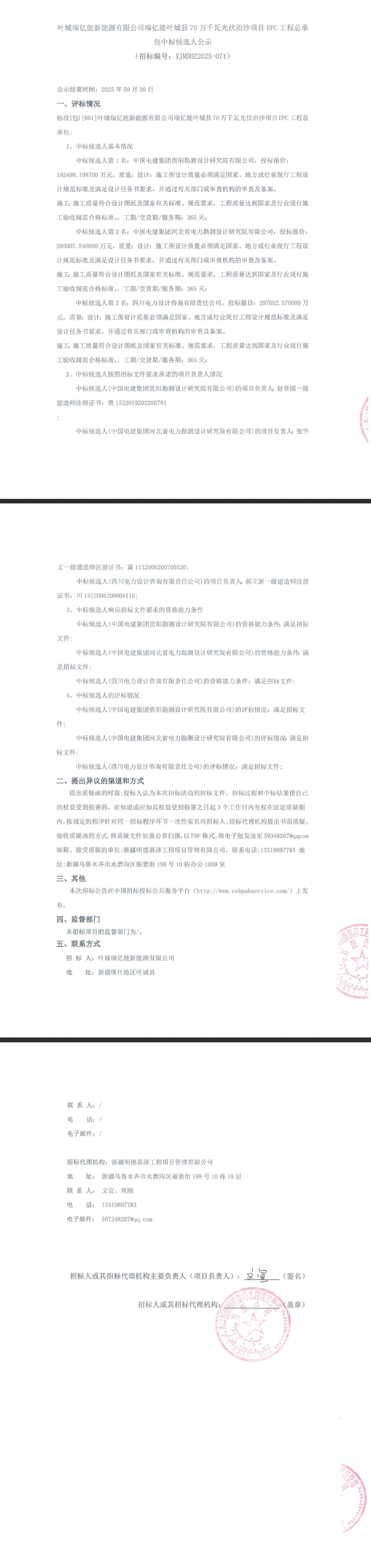 新能源圈获悉,日前,叶城瑞亿能新能源有限公司瑞亿能叶城县70万千瓦光伏治沙项目EPC工程总承包中标候选人公示。