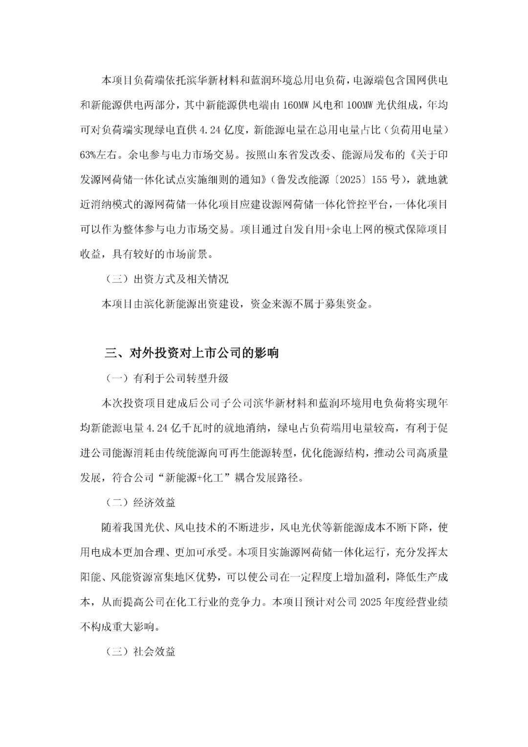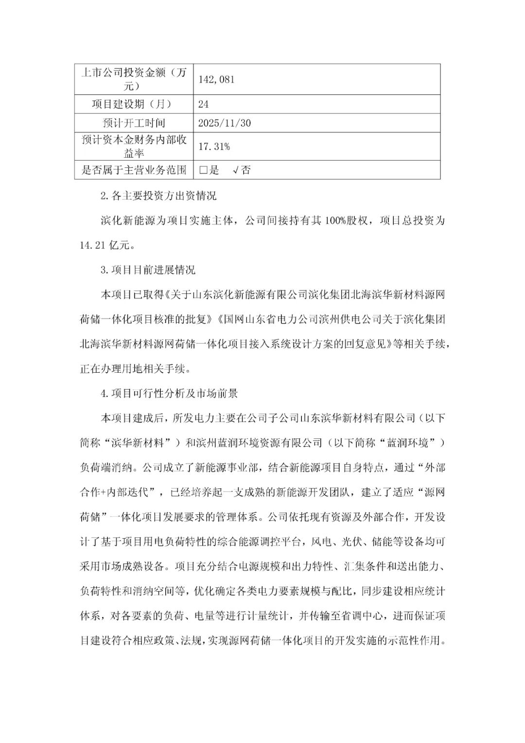 公告指出,公司拟通过控股子公司山东滨化新能源有限公司(简称“滨化新能源”)投资建设滨化集团北海滨华新材料源网荷储一体化项目。