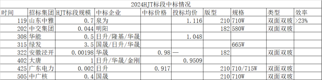 与主流市场不尽相同的是,HJT异质结组件在2024年的上半年迎来了久违的发展机遇和更加严苛的降本挑战。据记者观察,2024年上半年,在已公告的大型组件集采中,接连不断出现了不少单独的异质结标段以及异质结产品的高价中标案例。在2024年前5个月,SOLARZOOM统计到的148.98GW组件集采项目中,共有8个项目计 6.15GW的HJT异质结组件集中采购项目逐渐明朗:其中包括日升、隆基和华晟中标华能500MW HJT异质结组件项目,国晟、日升和华晟三家中标绿发3.5GW的HJT异质结标段,日升、华晟和金刚中标大唐1GW的HJT异质结组件集采项目,另外泉为科技中标山东中雅700MW异质结采购项目,明阳光伏中标中交集团的44MW的分布式光伏项目,东方日升中标广东电力2MW分布式光伏项目,国晟科技中标中广核招远400MW海上光伏项目。