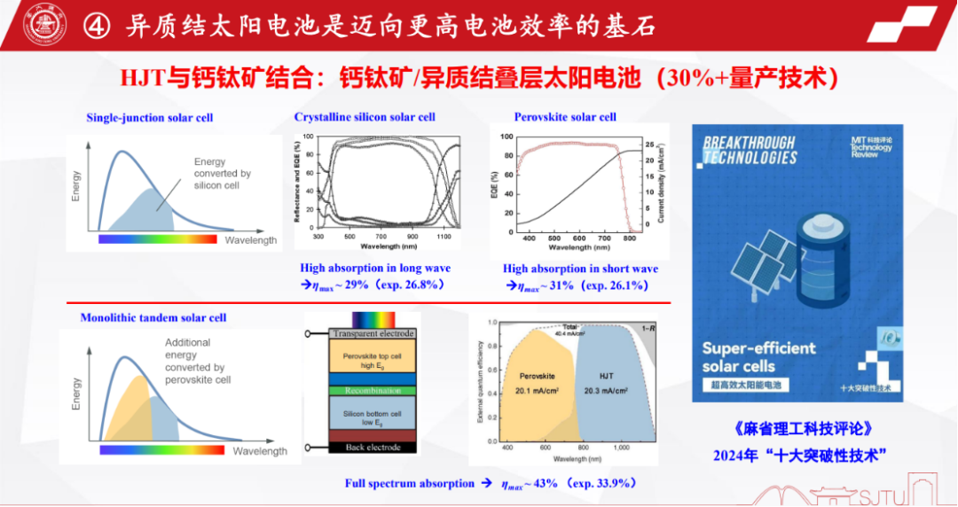 上海交通大学教授、博士生导师沈文忠教授,在《为什么选择晶硅异质结太阳电池技术》的发言中,详细对比了HJT和主流TOPCon技术的各项指征,指出“异质结电池技术是迈向更高电池效率的基石”。