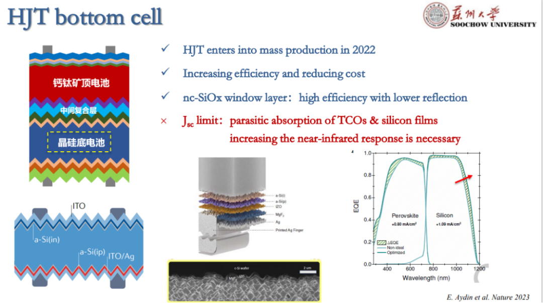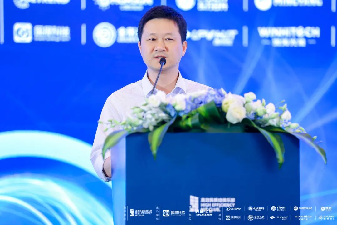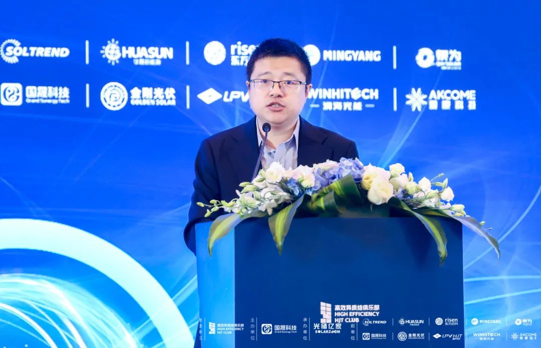 苏州大学能源学院特聘教授、博导、苏州大学-隆基绿能光伏技术联合实验室主任杨新波,做了名为《异质结叠层电池技术进展》,他指出异质结是很好的基底层,未来HJT-钙钛矿叠层电池的大面积制备,应该向更高透明度、纵向导电性能好、侧向导电性能弱的方向发展。