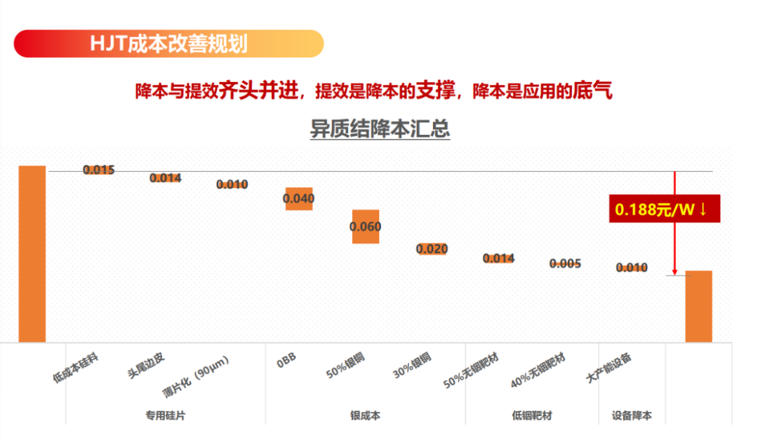 国晟世安科技股份有限公司CTO、中国科学院上海硅酸盐研究所博士张闻斌,代俱乐部就异质结降本增效路线做了演讲,他表示:“异质结电池成本中,硅片加浆料成本占比达到64%以上。包括PERC、TOPCon在内的所有晶硅电池,硅成本和银成本是降本路上两座绕不过的大山。异质结技术的全低温制程和工序简单的特点,在硅片的薄片化、低成本硅料、银的贱金属替代上有着天然的优势,天然适配这些降本项目”,未来异质结电池的成本完全可以控制在0.188元/W的理想水平,而这才是未来异质结大规模应用的底气。