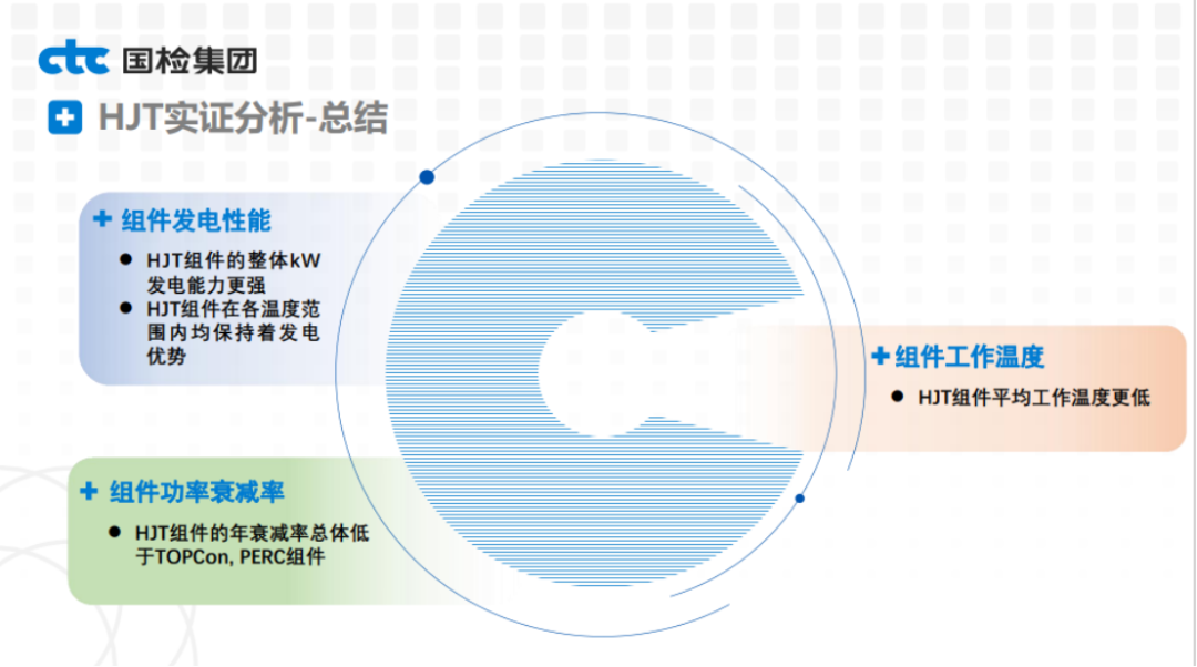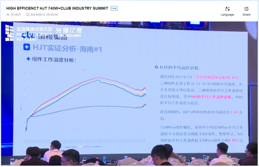 国检集团光伏院院长、国家太阳能光伏(电)产品检测中心主任王冬,与与会嘉宾一起分享了海南基地各项目的实证数据,他强调“HJT组件的整体kW发电能力更强,在各温度范围内均保持着发电优势”。