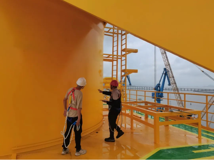 在导管架制作过程中,阳江公司上下一心,秉承人人都是质检员的原则,紧扣技术要求及规范,严格依照标准施工,现场管理人员及驻场监理全程进行质量监督及技术指导,到达了保证合格率,提高优良率的目标。联合验收过程中,验收组成员首先对产品质量进行了现场验收,依据完工检查项对导管架结构尺寸、焊缝质量、油漆质量以及内部附件安装完整性等方面进行了逐项检查;随后对导管架制作过程资料,重点对原材料材质证明书、复检报告、无损检测报告、油漆漏点及拉拔试验报告等主要资料进行了检查,各项参数均满足本项目图纸及技术要求。验收组一致认为防城港项目三台导管架出厂验收资料详细、真实、完整,验收设备符合图纸及规范要求,同时也对阳江公司在质量控制、技术保障措施等方面提出了赞扬和肯定。