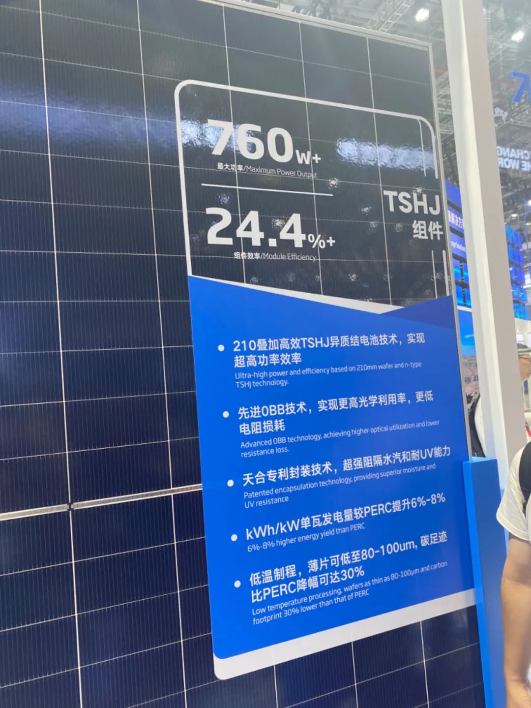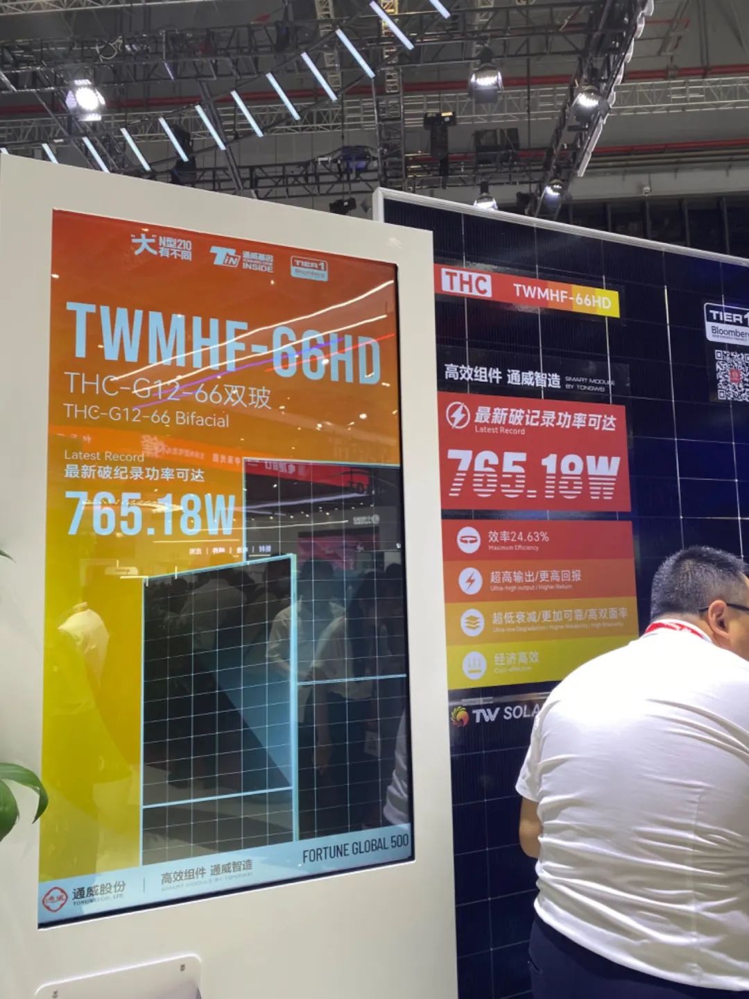 通威展出了TNC-G12R/G12新品组件,从性能看,TNC-G12R-66相较于182-72N型产品功率最高提升40w+。此外,通威TNC-G12组件最新破纪录功率可达765.18W,转换效率24.63%。