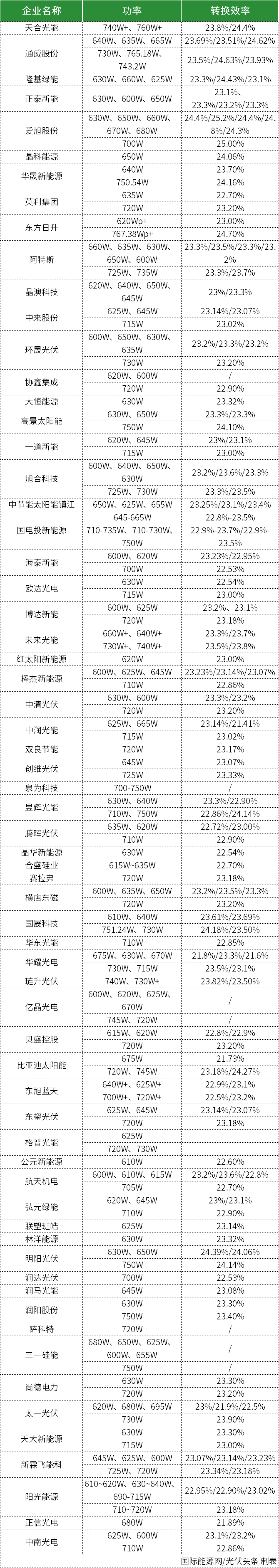 /光伏头条(PV-2005)梳理后发现,今年SNEC企业展出的光伏产品中,600W-700W大功率组件比例显著增加。其中,通威、天合、东方日升表现抢眼,组件功率最高均超760W+。