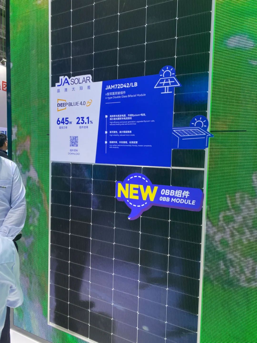 以晶澳为例,其在本次SNEC展会上推出了0BB(无主栅)高效组件产品解决方案。该方案增强了光吸收的面积,降低了内阻损耗和IAM损失,使组件功率高达645W,转换效率超过23.1%;同时,该方案通过低温焊接,减少了焊接过程中对电池片造成的热应力,有效减少了隐裂的产生,再次提升了组件可靠性。此外,晶澳科技0BB高效组件解决方案通过材料端和制造端的优化,还减少了耗材使用和电量消耗,降低了制造过程的碳足迹。
