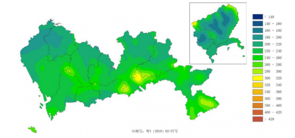 图:深圳市(含深汕地区)100m高度平均风功率密度分布图(单位:W/m2)