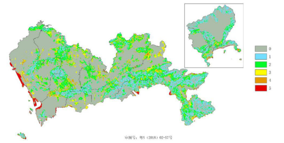 图:深圳市(含深汕地区)水平总辐射年总量1100kWh/m2以上等级光伏装机密度系数分布图(单位:MW/km2)