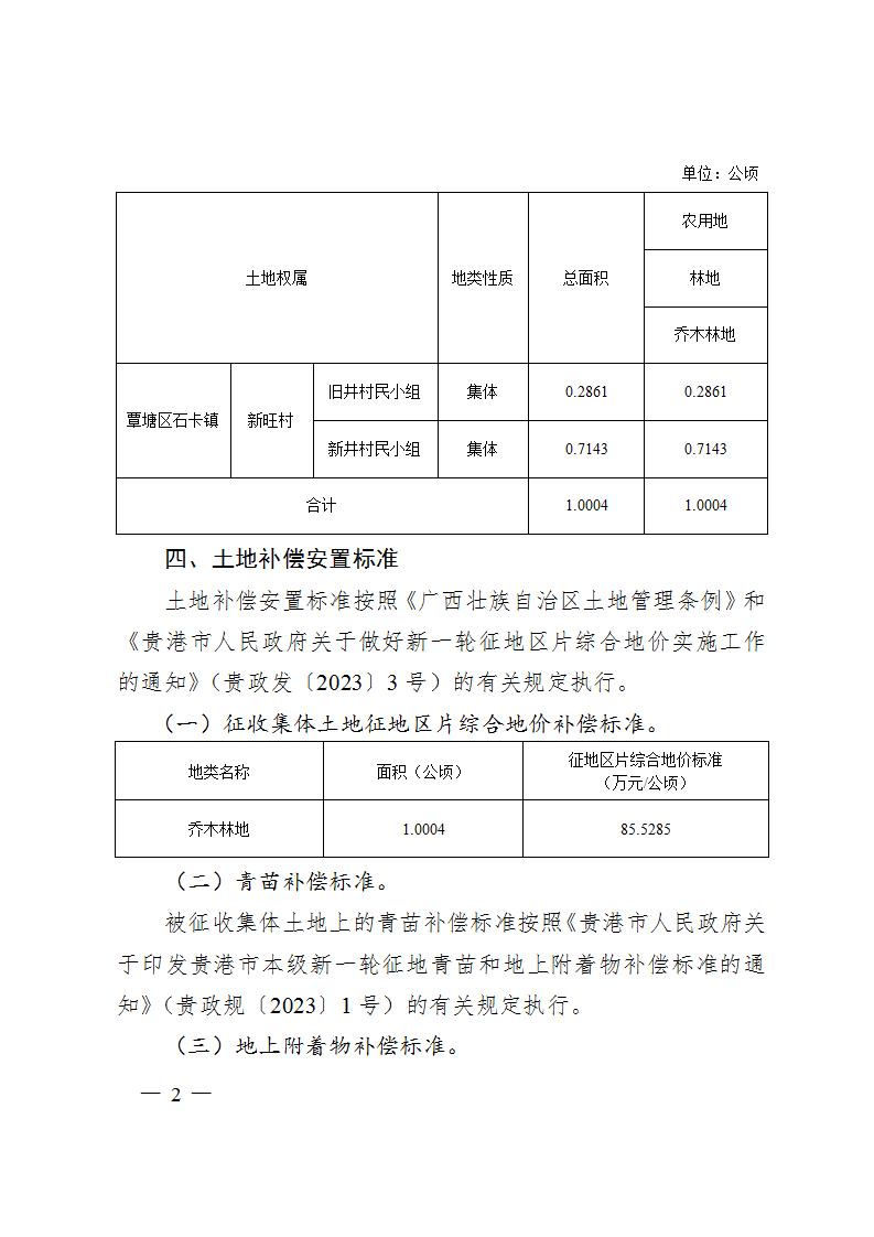 该项目征地面积为1.0004公顷,其中包括农用地、林地、乔木林地。土地补偿安置标准按照《广西壮族自治区土地管理条例》和《贵港市人民政府关于做好新一轮征地区片综合地价实施工作的通知》(贵政发〔2023〕3号)的有关规定执行。执行标准为85.5285万元/公顷。