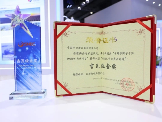 2024-04-30 近日, 第十七届(2024)国际太阳能光伏与智慧能源展览会在上海国家会展中心举办,作为全球新能源领域投资、建设、运营一体化的领军企业,中国电建携水、能、城、数核心业务闪耀亮相。期间举行SNEC十大亮点评选及颁奖典礼,贵州工程公司承建的卡塔尔800兆瓦光伏电站荣膺十大亮点吉瓦级金奖。