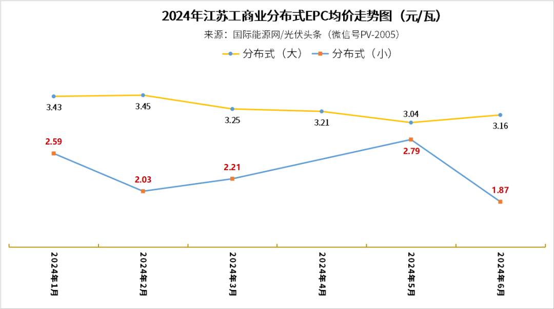 分布式光伏小EPC方面。江苏不包含光伏组件等关键设备采购的分布式光伏小EPC项目,均价从1月开始,起伏不定,5月均价高达2.64元/W,6月下滑至1.6元/W。