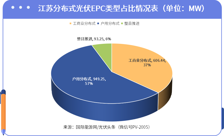 具体分布式EPC方面,工商业分布式合计容量606.44MW,占比达到37%;整县推进集中开发项目合计容量93.25MW,占比6%;户用分布式占比最高达57%。